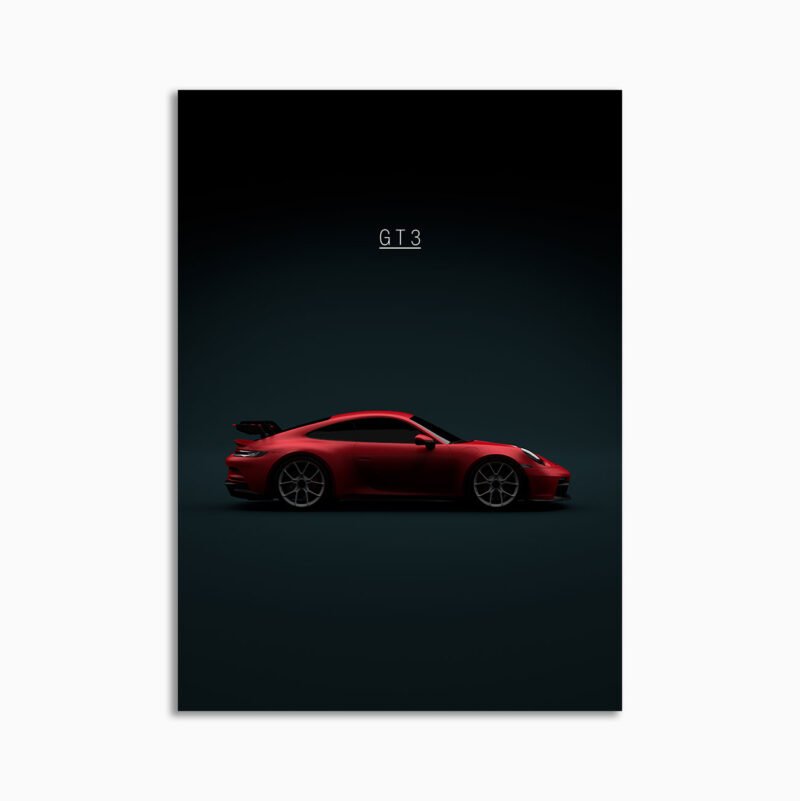 This 2021 Porsche 992 GT3 Guards Red digital poster is minimalist motorsport-inspired wall art – built around stance, speed, and a restrained aesthetic.