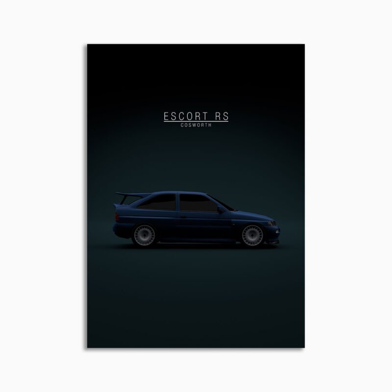 This Ford Escort RS Cosworth 1994 blue digital poster is minimalist motorsport-inspired wall art – built around stance, speed, and a restrained aesthetic.