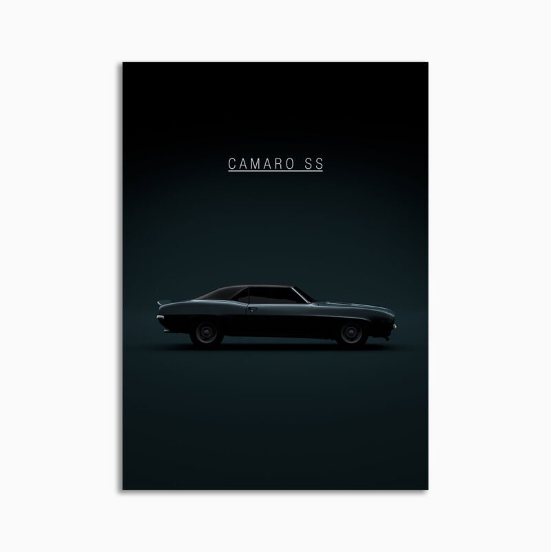 This 1969 Chevrolet Camaro SS-396 Coupe digital poster is minimalist automotive wall art designed for modern interiors. It emphasizes silhouette, proportion, and a premium, gallery-like presentation.