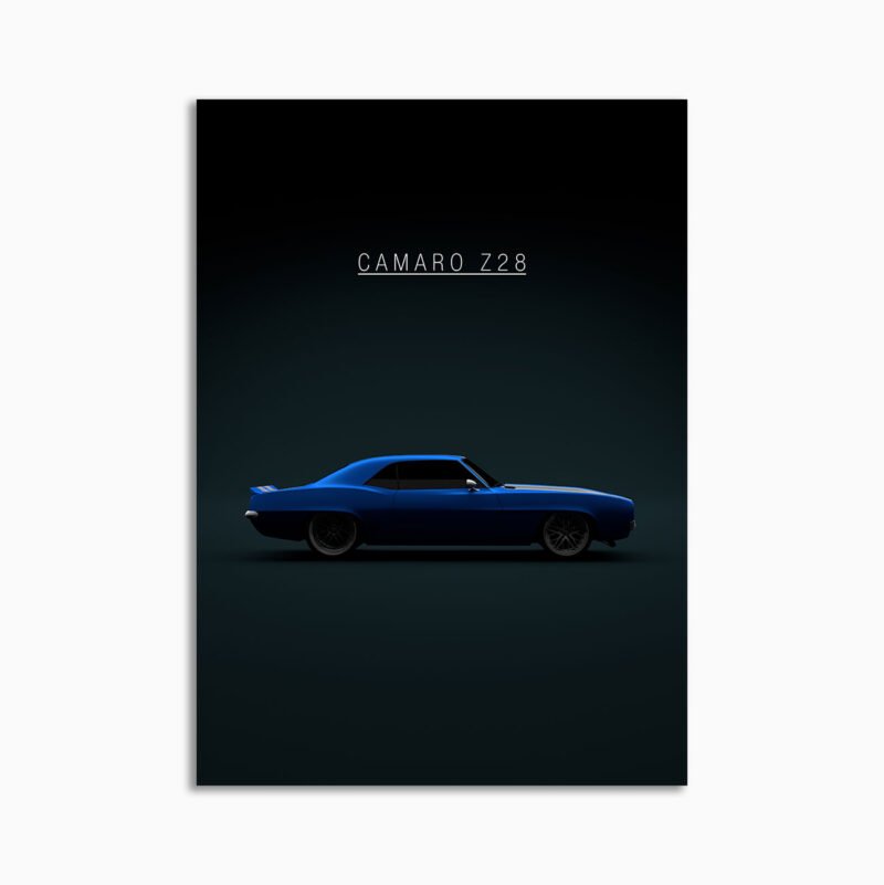 This Chevrolet Camaro Z28 302 1969 – Blue digital poster is minimalist automotive wall art designed for modern interiors. It emphasizes silhouette, proportion, and a premium, gallery-like presentation.