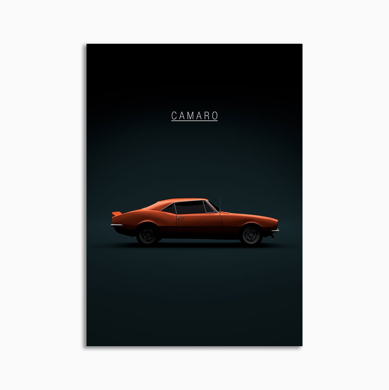 This Chevrolet Camaro 1967 – Orange digital poster is minimalist automotive wall art designed for modern interiors. It emphasizes silhouette, proportion, and a premium, gallery-like presentation.