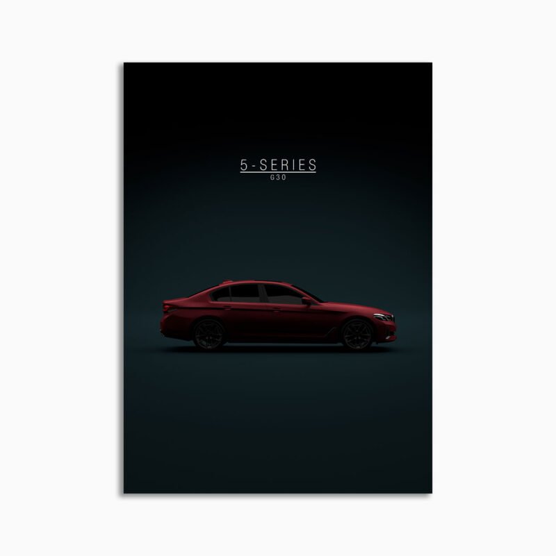 This 2021 BMW 5-series G30 – Red digital poster is minimalist automotive wall art designed for modern interiors. It emphasizes silhouette, proportion, and a premium, gallery-like presentation.