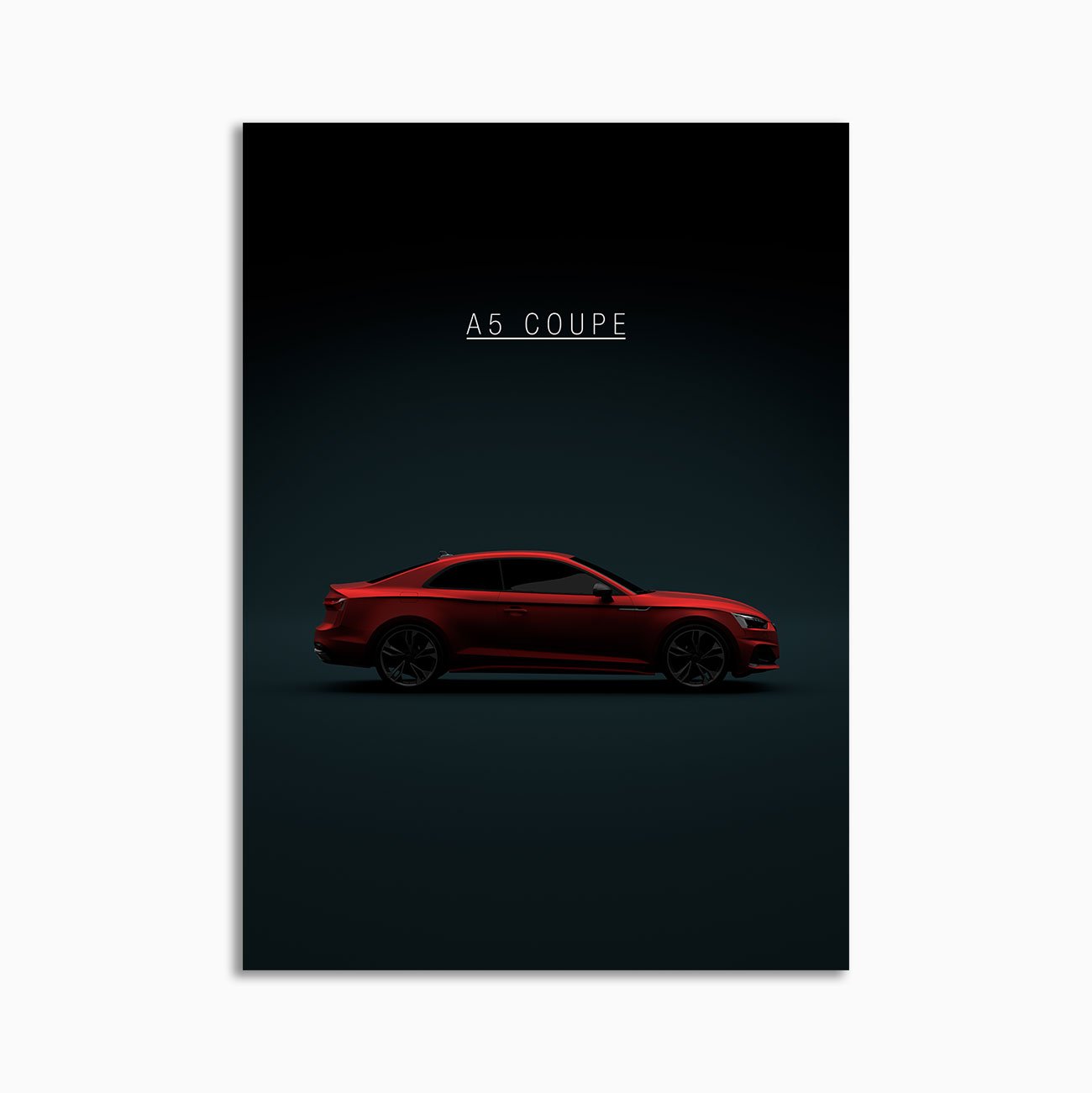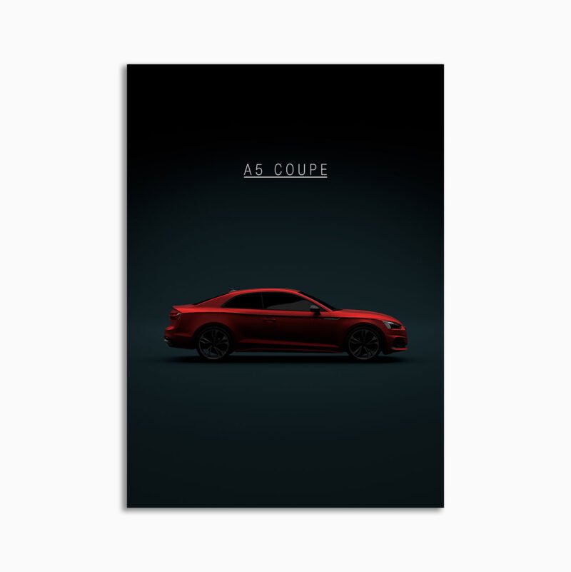 This Audi A5 Coupe 2020 – Red digital poster is minimalist automotive wall art designed for modern interiors. It emphasizes silhouette, proportion, and a premium, gallery-like presentation.