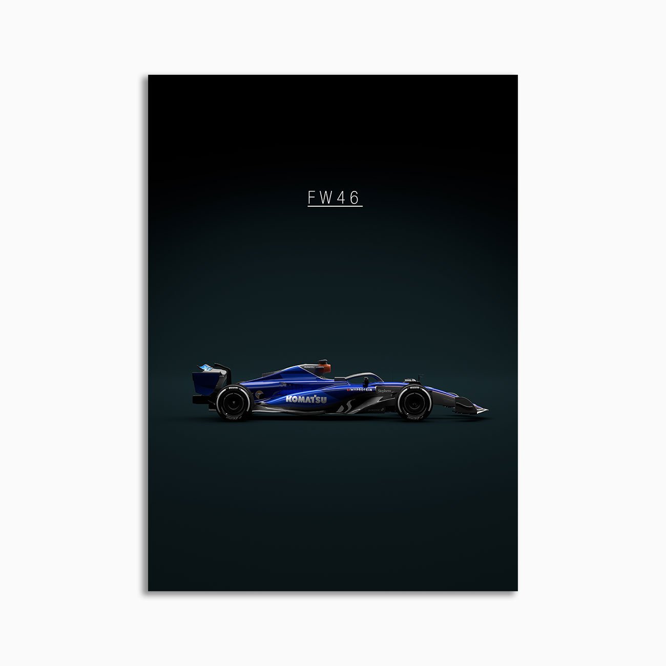 This WILLIAMS FW-46 2024 digital poster is minimalist automotive wall art designed for modern interiors. It emphasizes silhouette, proportion, and a premium, gallery-like presentation.