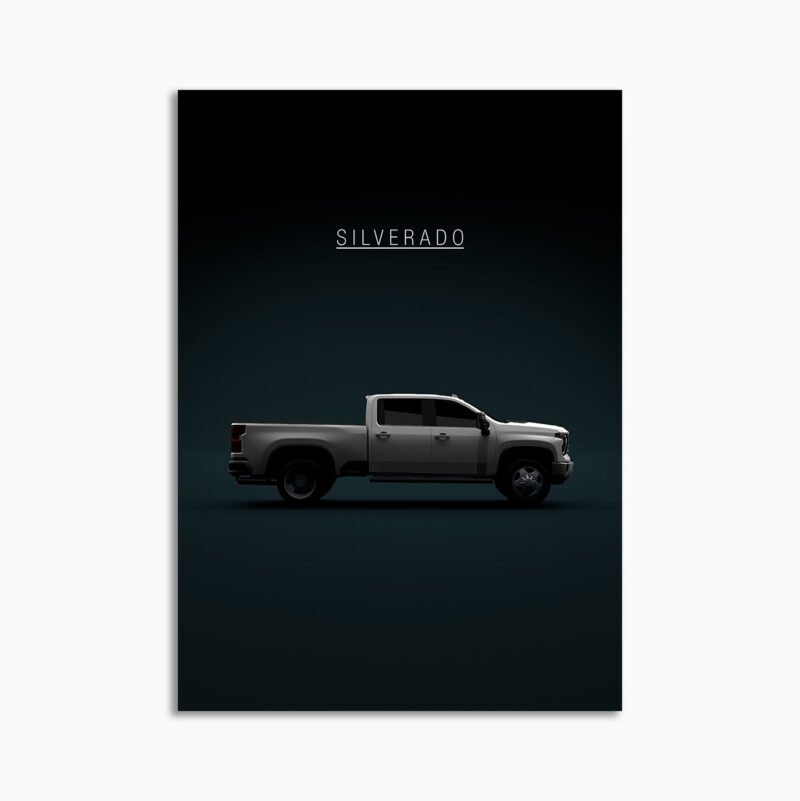 This Chevrolet Silverado 3500 ltz dually 2024 White digital poster is minimalist automotive wall art designed for modern interiors. It emphasizes silhouette, proportion, and a premium, gallery-like presentation.