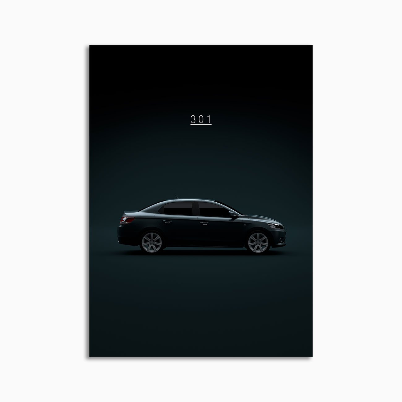 This 2013 Peugeot 301 digital poster is minimalist automotive wall art designed for modern interiors. It emphasizes silhouette, proportion, and a premium, gallery-like presentation.