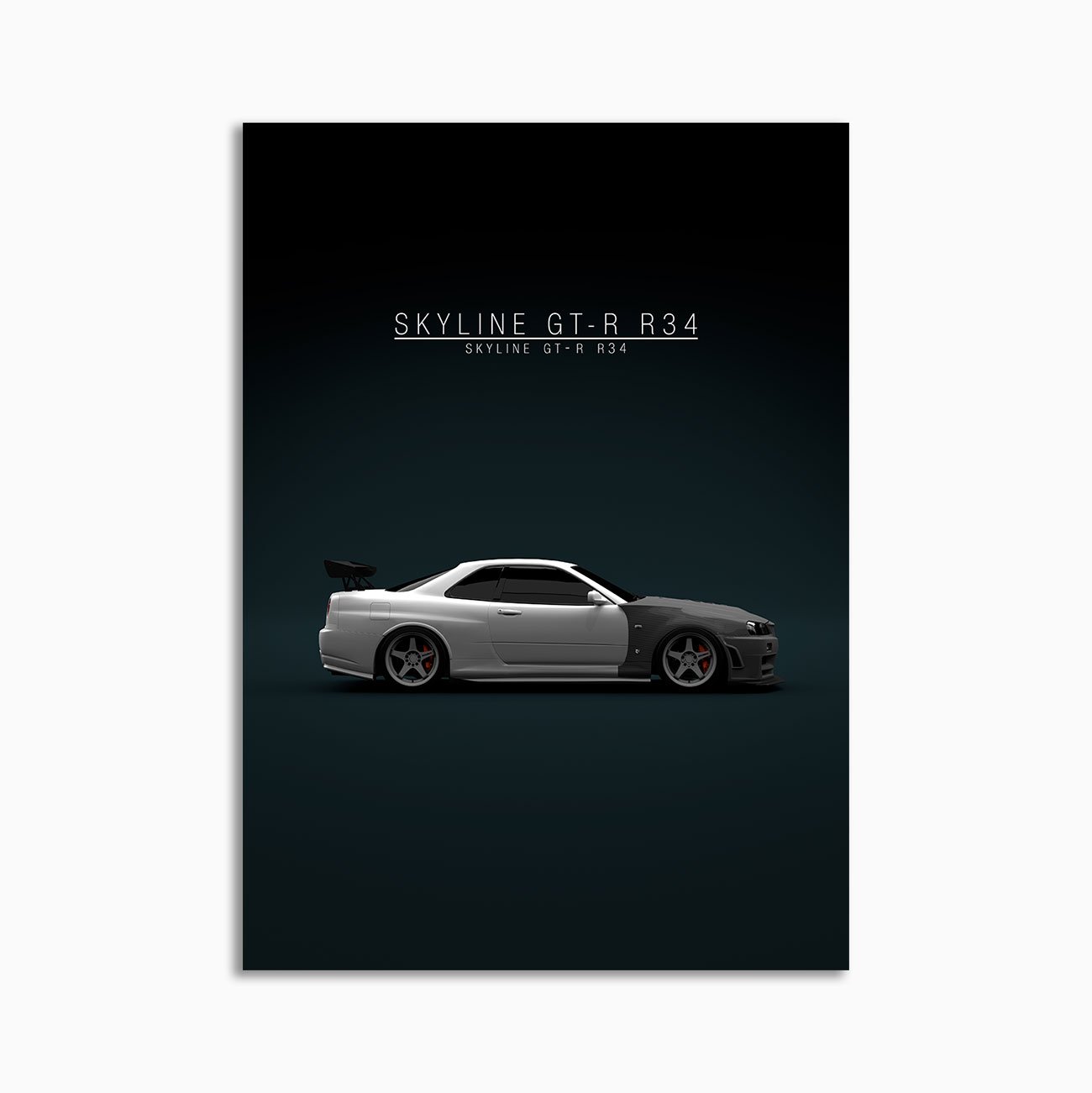 This Nissan Skyline R34 V-spec Performance digital poster is minimalist automotive wall art designed for modern interiors. It emphasizes silhouette, proportion, and a premium, gallery-like presentation.