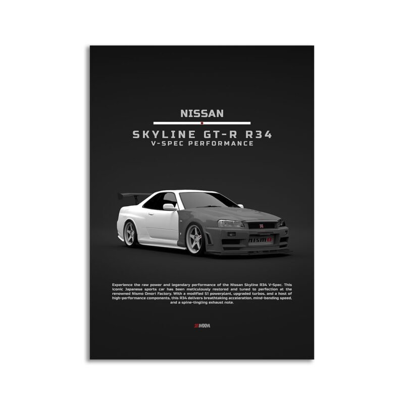 This Nissan Skyline R34 V-spec Performance – Front digital poster is clean, technical automotive wall art with a detail-forward, premium look. It’s built for modern interiors where less is more – strong silhouette, controlled contrast, and a focused composition.