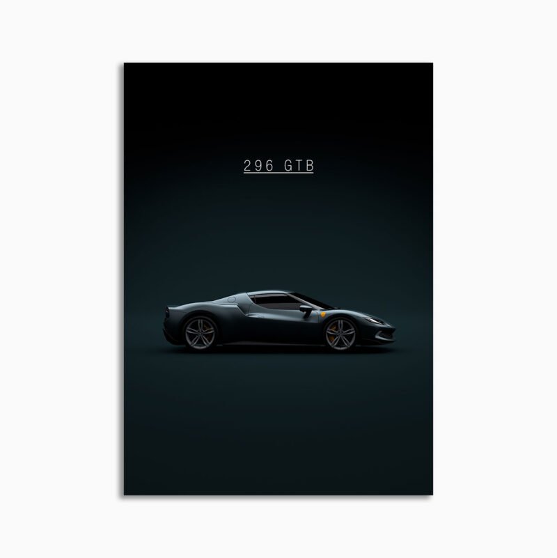 This 2021 Ferrari 296 GTB digital poster is minimalist automotive wall art designed for modern interiors. It emphasizes silhouette, proportion, and a premium, gallery-like presentation.