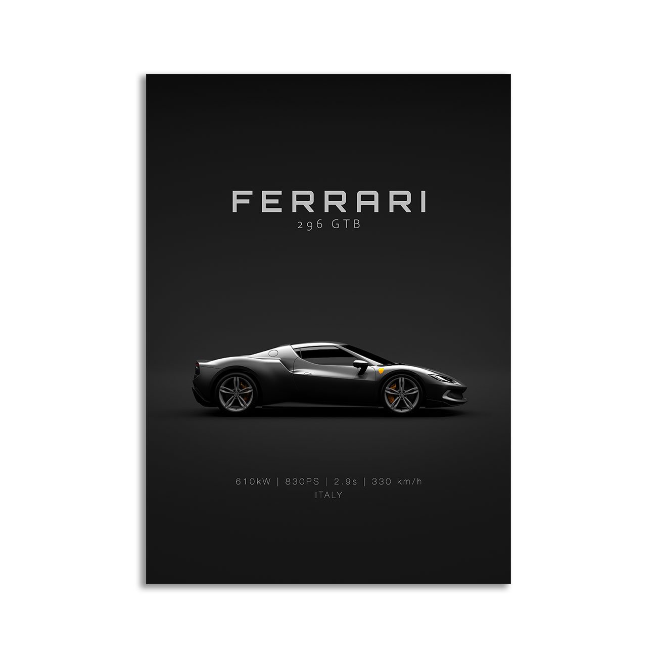 This 2021 Ferrari 296 GTB digital poster is clean, technical automotive wall art with a detail-forward, premium look. It’s built for modern interiors where less is more – strong silhouette, controlled contrast, and a focused composition.