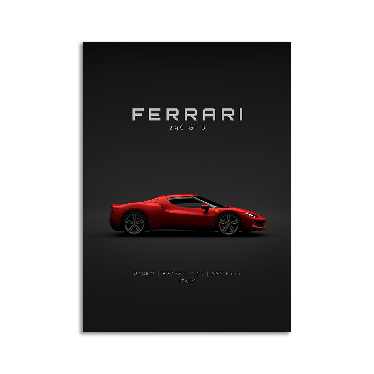 This 2021 Ferrari 296 GTB – Red digital poster is clean, technical automotive wall art with a detail-forward, premium look. It’s built for modern interiors where less is more – strong silhouette, controlled contrast, and a focused composition.