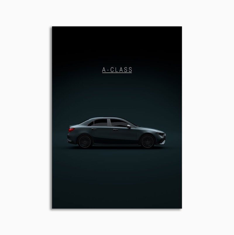 This Mercedes-Benz A-Class Sedan AMG 2023 digital poster is minimalist automotive wall art designed for modern interiors. It emphasizes silhouette, proportion, and a premium, gallery-like presentation.