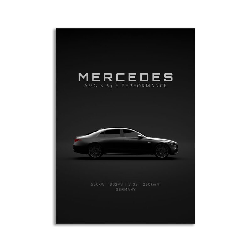 This Mercedes AMG S 63 E Performance digital poster is clean, technical automotive wall art with a detail-forward, premium look. It’s built for modern interiors where less is more – strong silhouette, controlled contrast, and a focused composition.