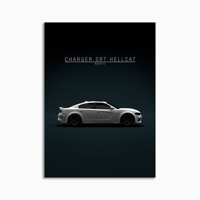 This Dodge Charger SRT Hellcat RedEye – White digital poster is minimalist automotive wall art designed for modern interiors. It emphasizes silhouette, proportion, and a premium, gallery-like presentation.