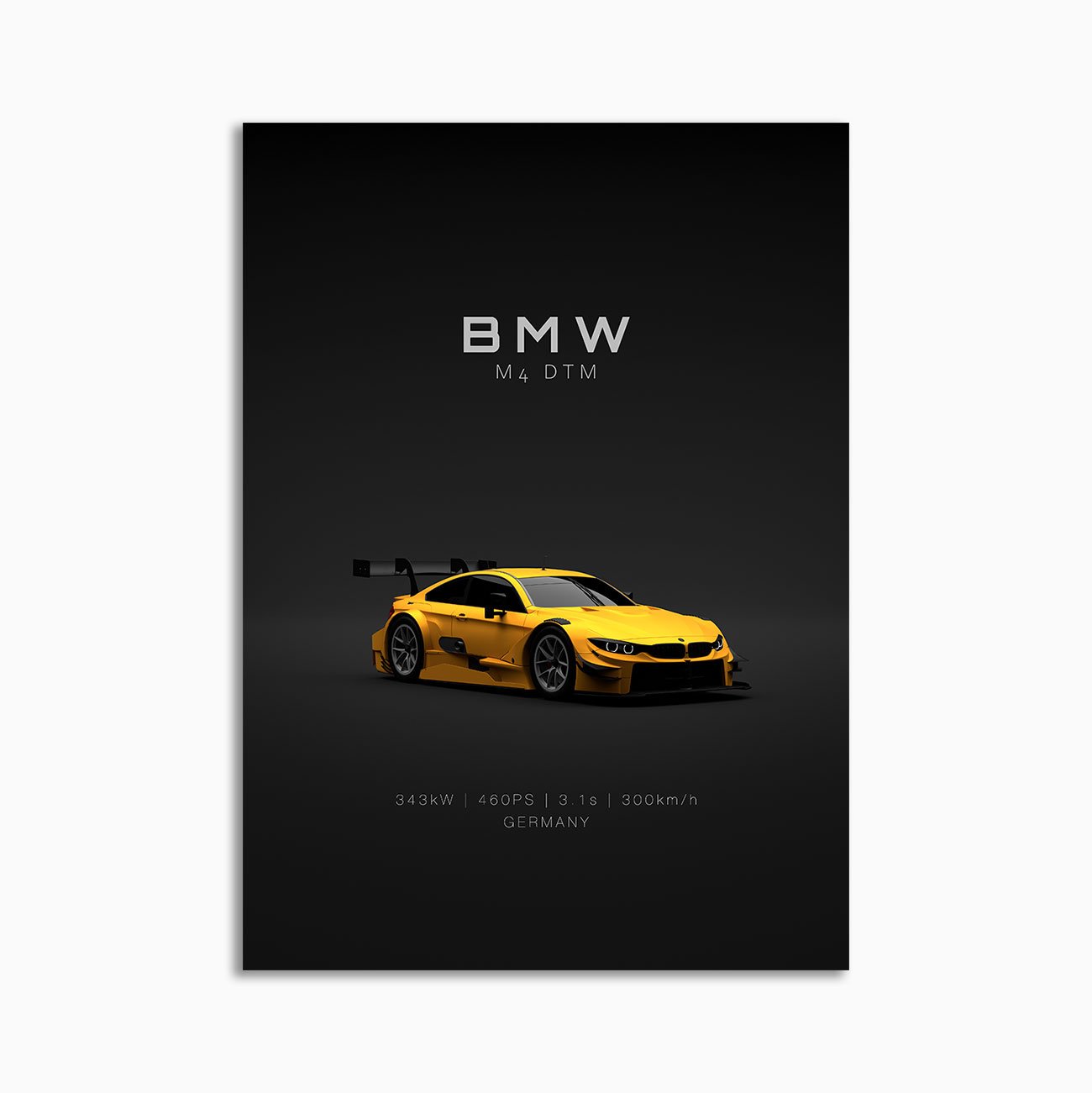 This BMW M4 DTM 2015 Race Car – Yellow – front digital poster is clean, technical automotive wall art with a detail-forward, premium look. It’s built for modern interiors where less is more – strong silhouette, controlled contrast, and a focused composition.