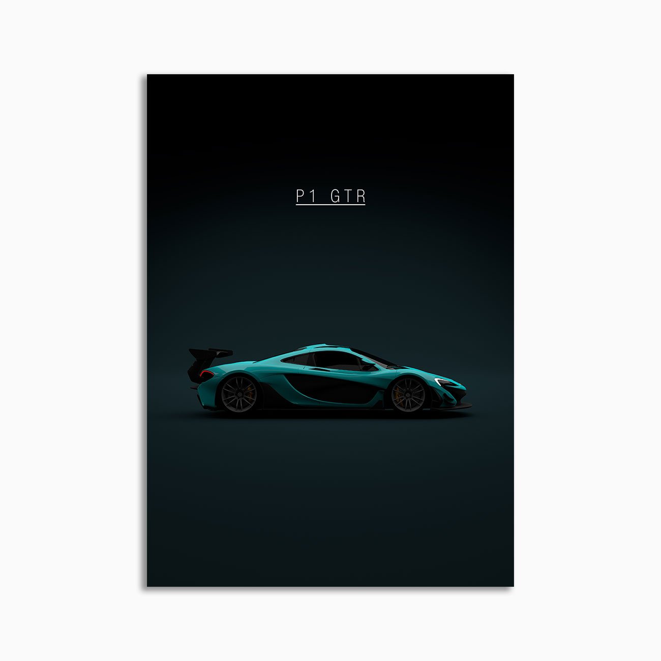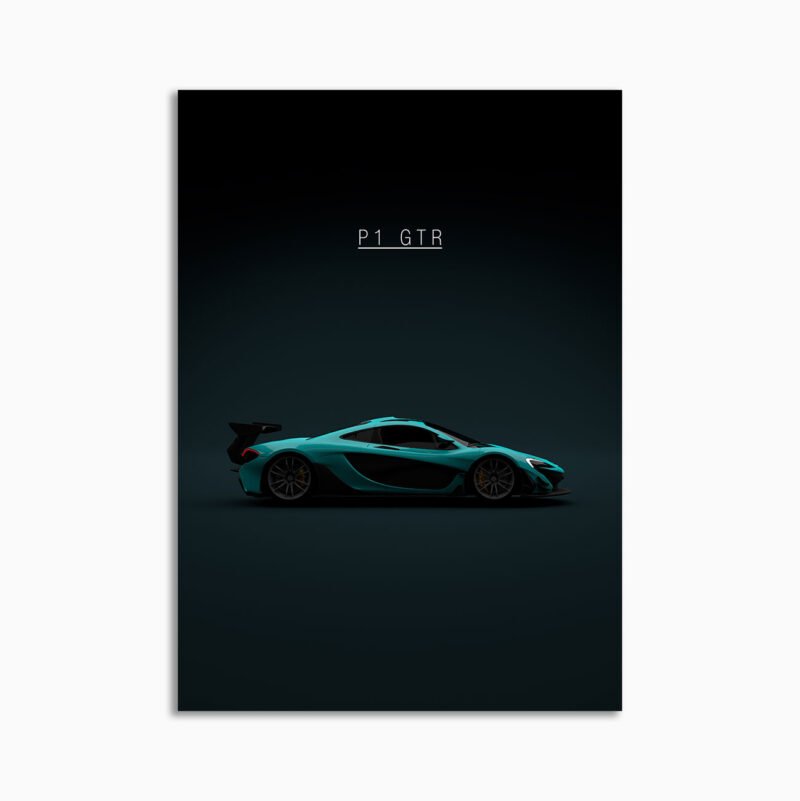 This McLaren P1 GTR – Cyan digital poster is minimalist automotive wall art designed for modern interiors. It emphasizes silhouette, proportion, and a premium, gallery-like presentation.