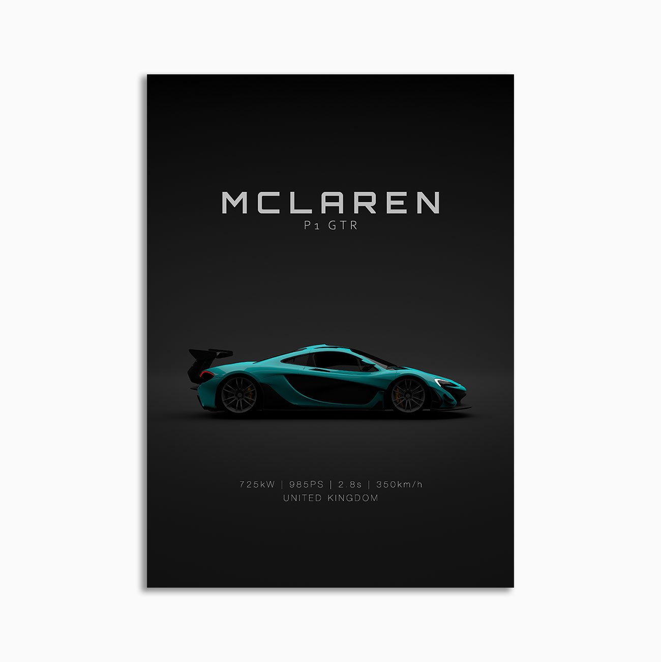 This McLaren P1 GTR – Cyan digital poster is clean, technical automotive wall art with a detail-forward, premium look. It’s built for modern interiors where less is more – strong silhouette, controlled contrast, and a focused composition.