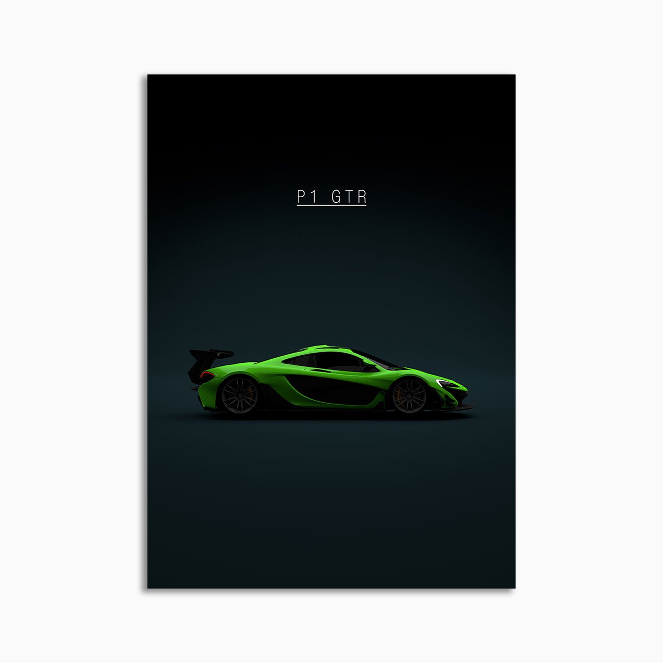 This McLaren P1 GTR – Green digital poster is minimalist automotive wall art designed for modern interiors. It emphasizes silhouette, proportion, and a premium, gallery-like presentation.