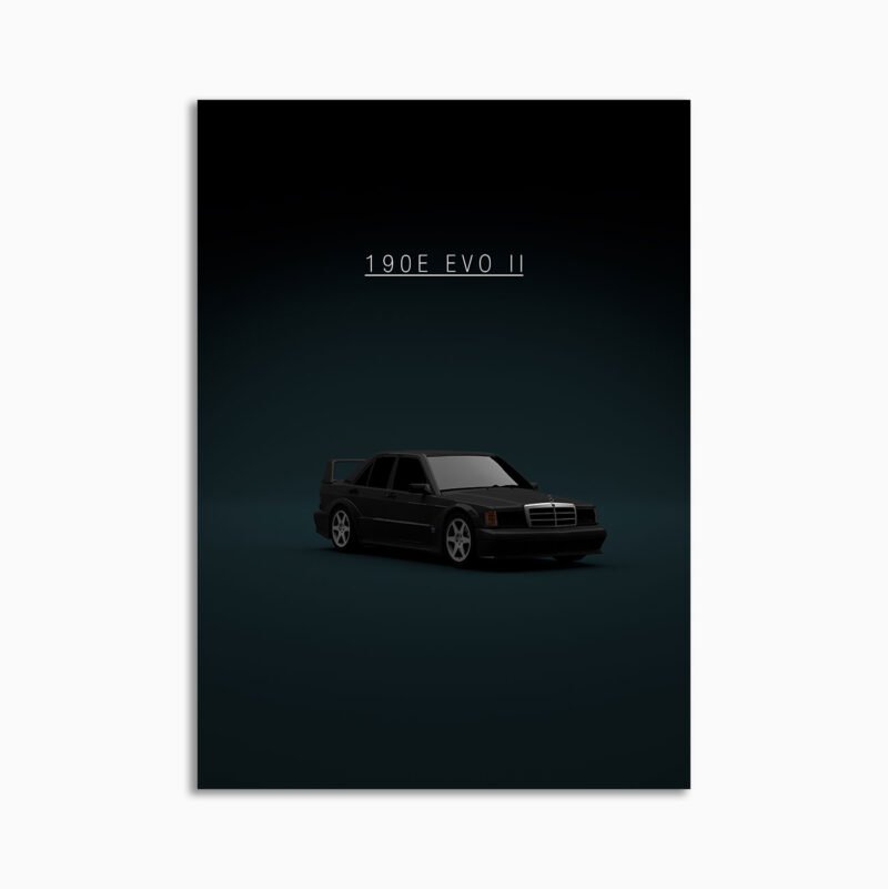 This Mercedes-Benz 190E EVO II – Black – Front digital poster is minimalist automotive wall art designed for modern interiors. It emphasizes silhouette, proportion, and a premium, gallery-like presentation.
