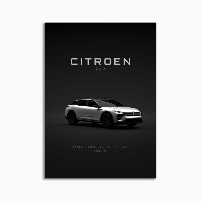 This Citroen C5 X 2022 – Front digital poster is clean, technical automotive wall art with a detail-forward, premium look. It’s built for modern interiors where less is more – strong silhouette, controlled contrast, and a focused composition.