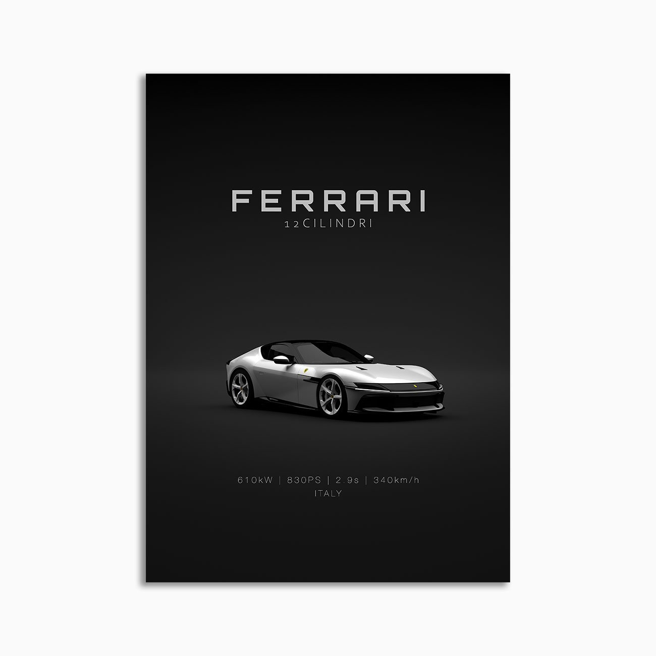This 2025 Ferrari 12Cilindri White Front digital poster is clean, technical automotive wall art with a detail-forward, premium look. It’s built for modern interiors where less is more – strong silhouette, controlled contrast, and a focused composition.
