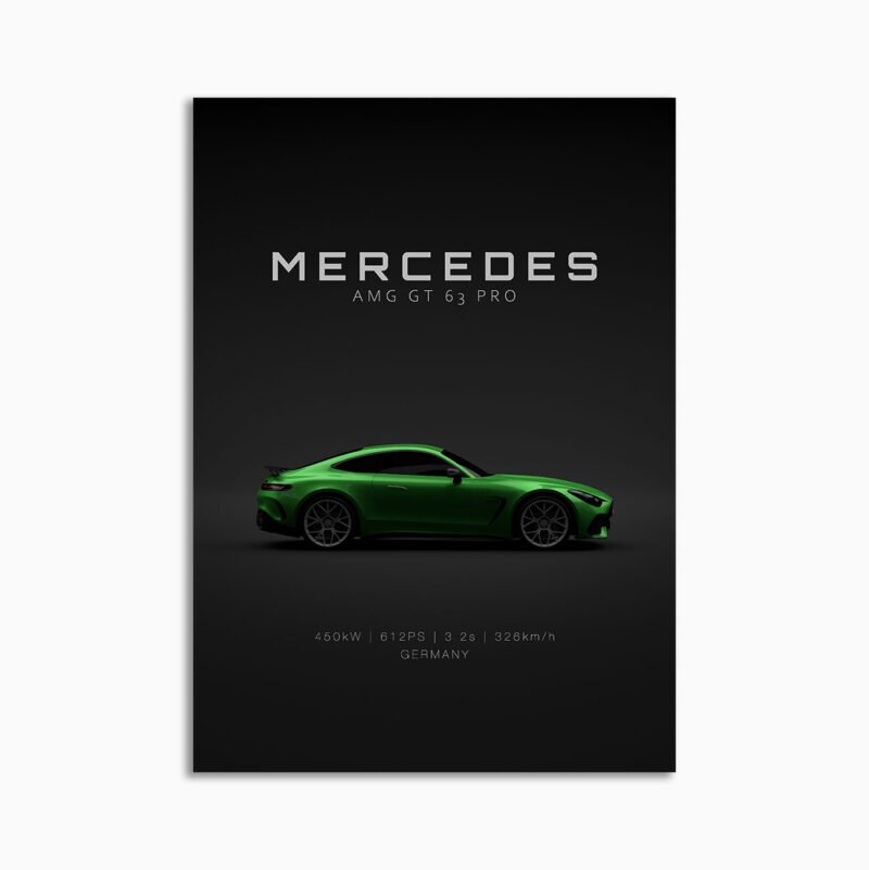 This Mercedes-Benz AMG GT63 PRO 2025 Green digital poster is clean, technical automotive wall art with a detail-forward, premium look. It’s built for modern interiors where less is more – strong silhouette, controlled contrast, and a focused composition.