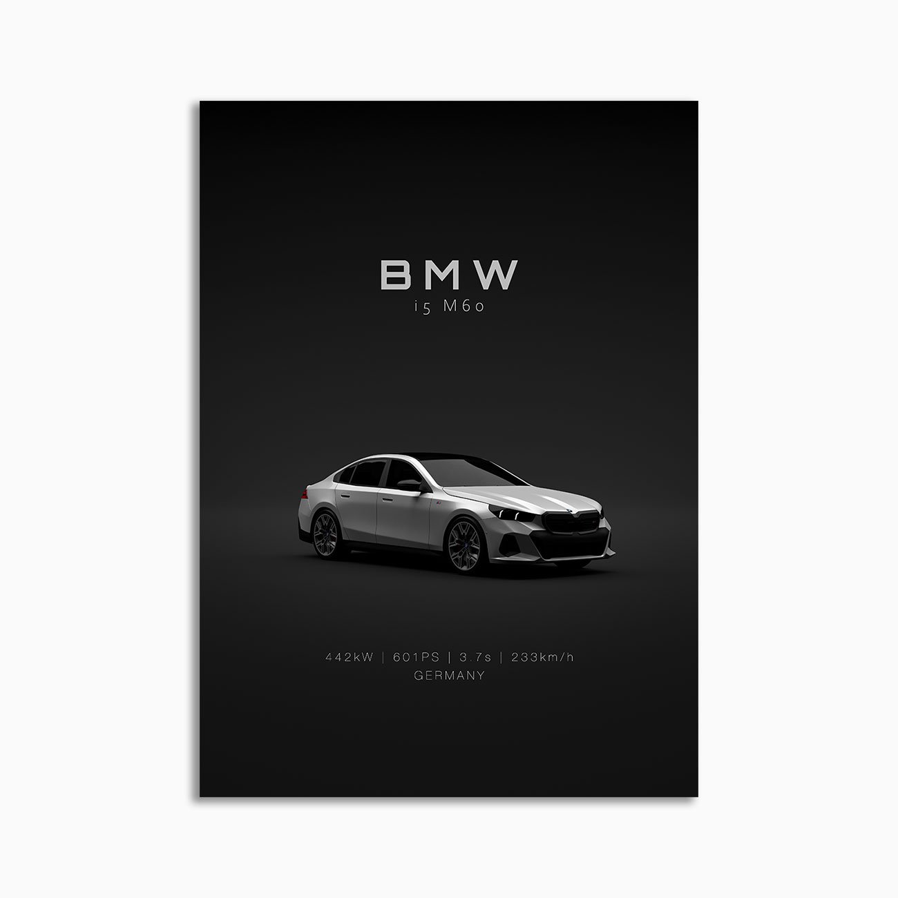 This BMW i5 M60 2024 Front White digital poster is clean, technical automotive wall art with a detail-forward, premium look. It’s built for modern interiors where less is more – strong silhouette, controlled contrast, and a focused composition.