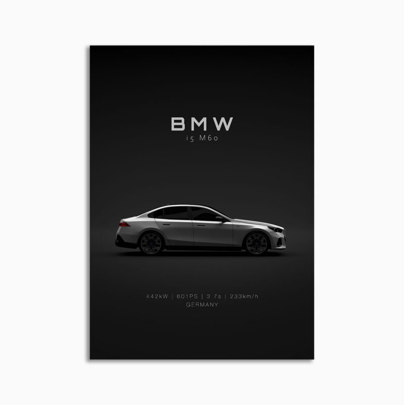 This BMW i5 M60 2024 White digital poster is clean, technical automotive wall art with a detail-forward, premium look. It’s built for modern interiors where less is more – strong silhouette, controlled contrast, and a focused composition.