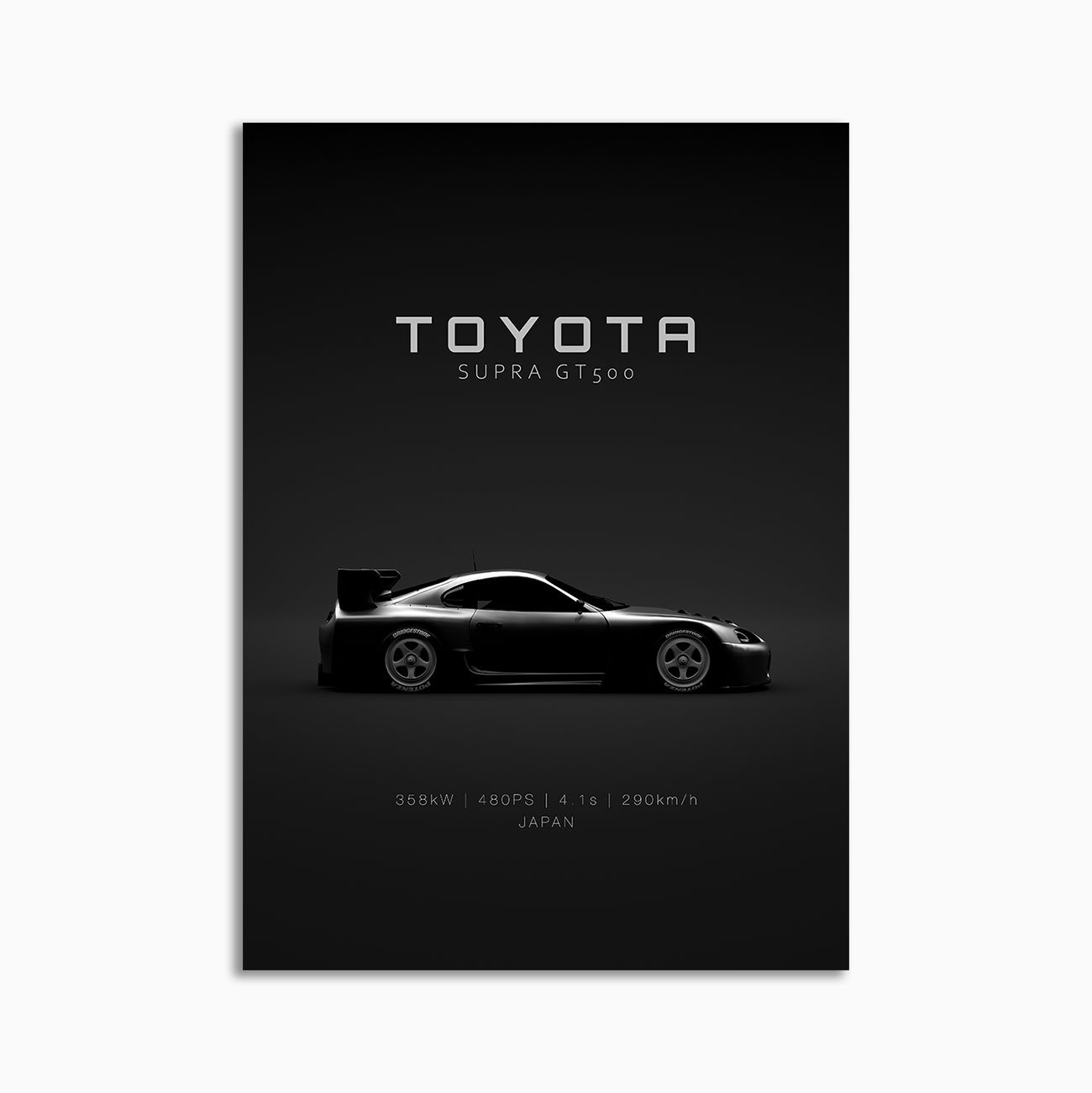 This Toyota Supra JGTC500 (LM GT1) 1996 – Black digital poster is clean, technical automotive wall art with a detail-forward, premium look. It’s built for modern interiors where less is more – strong silhouette, controlled contrast, and a focused composition.