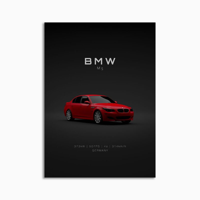 This 2009 BMW M5 E60 – Red digital poster is clean, technical automotive wall art with a detail-forward, premium look. It’s built for modern interiors where less is more – strong silhouette, controlled contrast, and a focused composition.