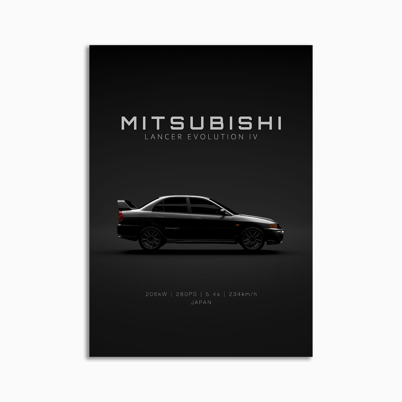 This 1996 Mitsubishi Lancer Evolution IV digital poster is clean, technical automotive wall art with a detail-forward, premium look. It’s built for modern interiors where less is more – strong silhouette, controlled contrast, and a focused composition.