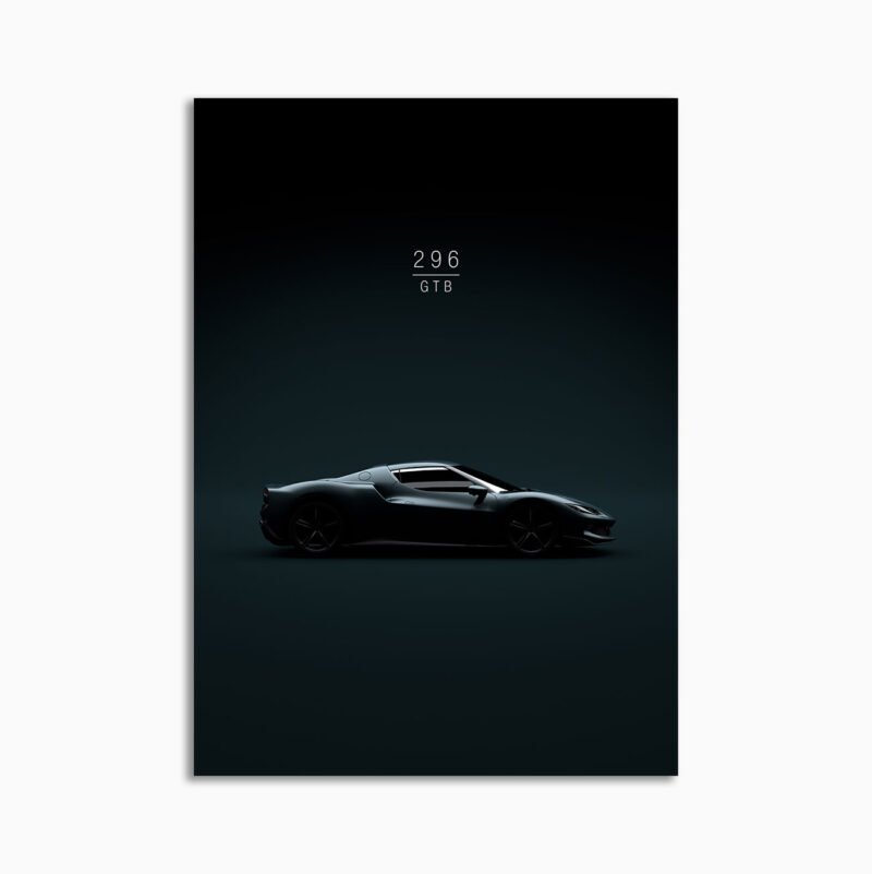 This 2021 Ferrari 296 GTB digital poster is minimalist automotive wall art designed for modern interiors. It emphasizes silhouette, proportion, and a premium, gallery-like presentation.