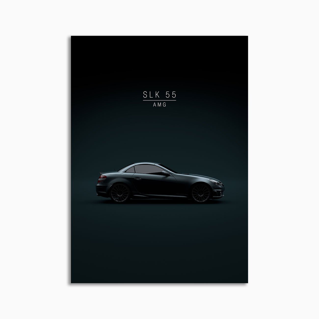 This 2010 Mercedes-Benz SLK 55 AMG digital poster is minimalist automotive wall art designed for modern interiors. It emphasizes silhouette, proportion, and a premium, gallery-like presentation.