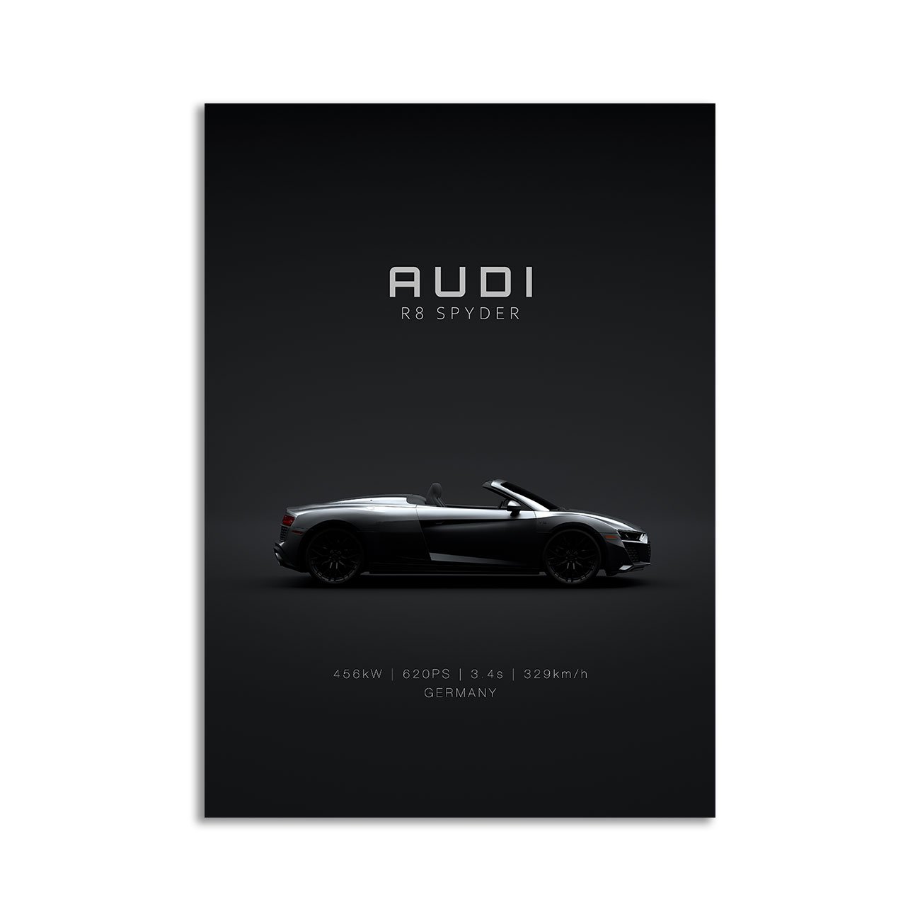 This Audi R8 Spyder 2020 digital poster is clean, technical automotive wall art with a detail-forward, premium look. It’s built for modern interiors where less is more – strong silhouette, controlled contrast, and a focused composition.
