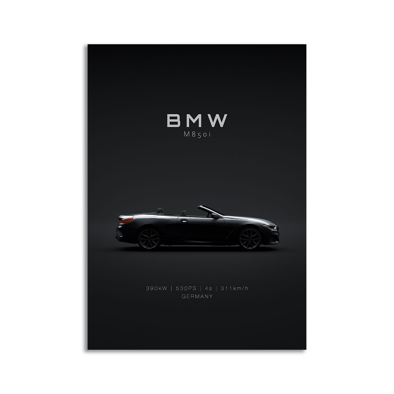 This 2021 BMW 8 Series M850i Convertible digital poster is clean, technical automotive wall art with a detail-forward, premium look. It’s built for modern interiors where less is more – strong silhouette, controlled contrast, and a focused composition.