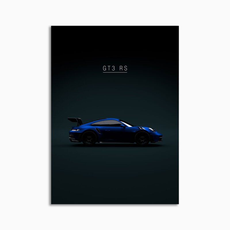 This Porsche 911 GT3 RS 2022 Gentian Blue digital poster is minimalist motorsport-inspired wall art – built around stance, speed, and a restrained aesthetic.