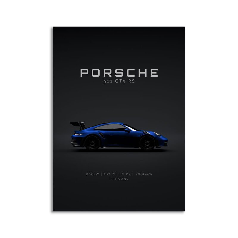 This Porsche 911 GT3 RS 2022 Gentian Blue digital poster is clean, technical automotive wall art with a detail-forward, premium look. It’s built for modern interiors where less is more – strong silhouette, controlled contrast, and a focused composition.