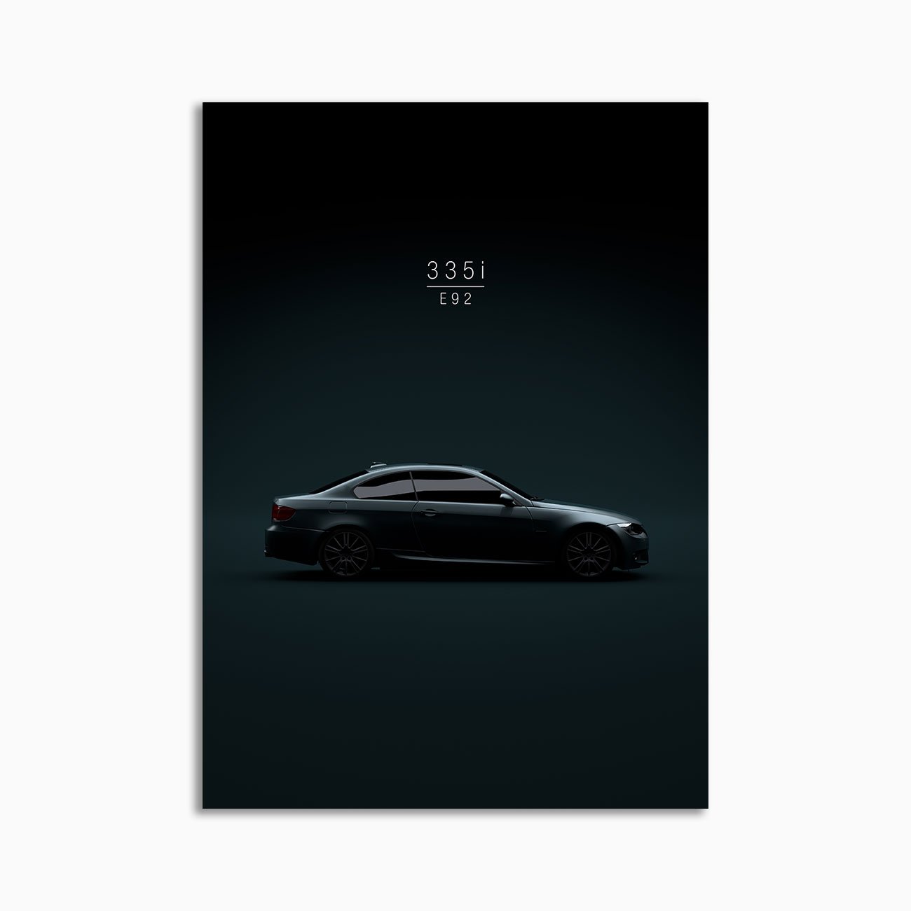 This 2011 BMW e92 335i digital poster is minimalist automotive wall art designed for modern interiors. It emphasizes silhouette, proportion, and a premium, gallery-like presentation.