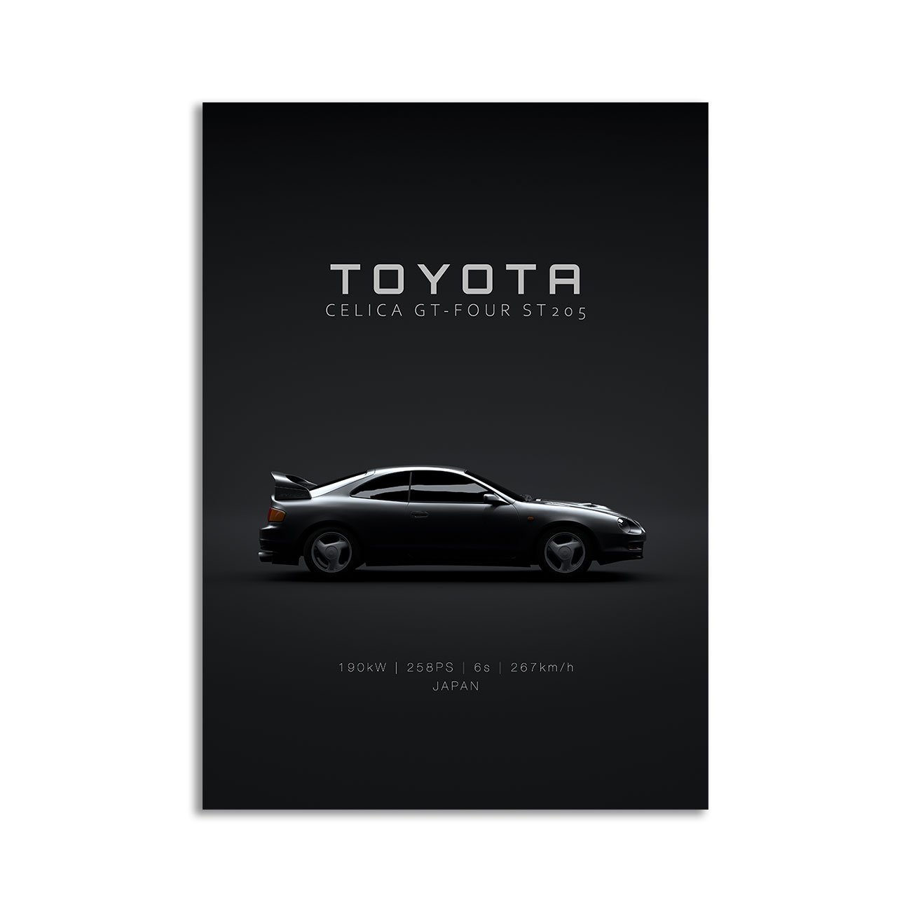 This 1994 Toyota Celica GT-FOUR (ST205) digital poster is clean, technical automotive wall art with a detail-forward, premium look. It’s built for modern interiors where less is more – strong silhouette, controlled contrast, and a focused composition.