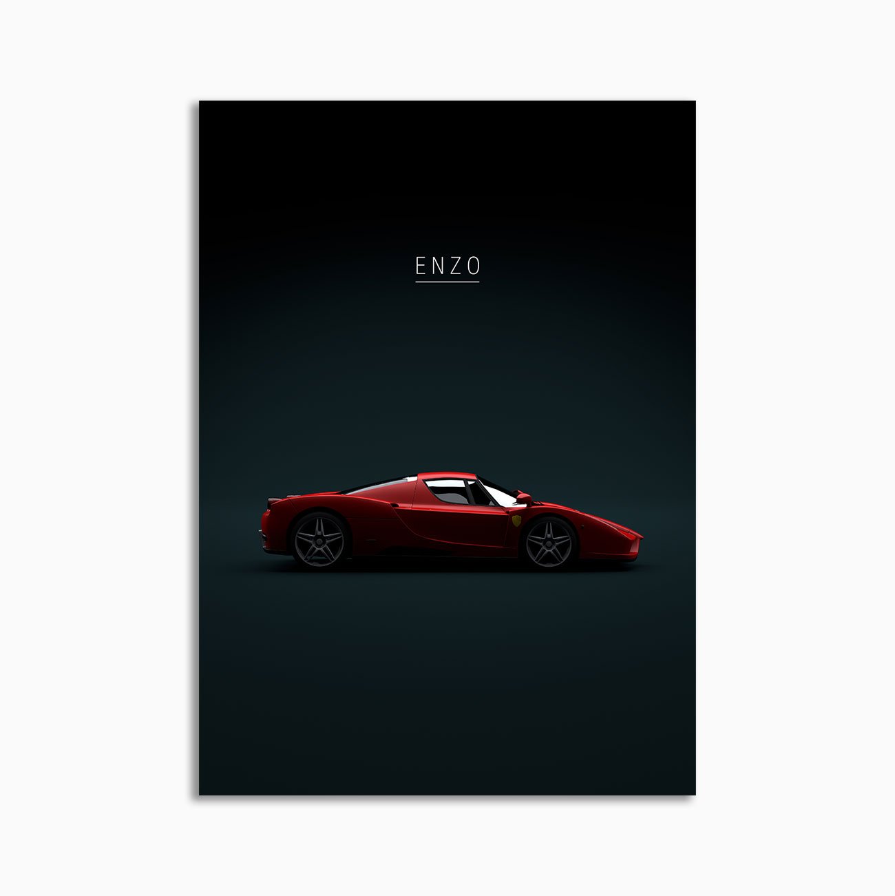 This 2002 Ferrari Enzo digital poster is minimalist automotive wall art designed for modern interiors. It emphasizes silhouette, proportion, and a premium, gallery-like presentation.