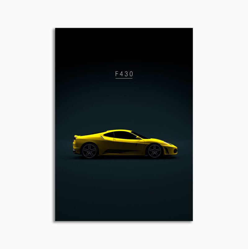 This 2004 Ferrari F430 Yellow digital poster is minimalist automotive wall art designed for modern interiors. It emphasizes silhouette, proportion, and a premium, gallery-like presentation.