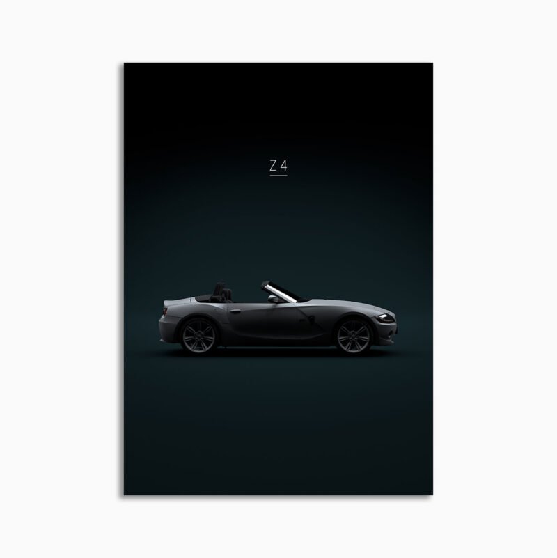 This BMW Z4 2003 digital poster is minimalist automotive wall art designed for modern interiors. It emphasizes silhouette, proportion, and a premium, gallery-like presentation.