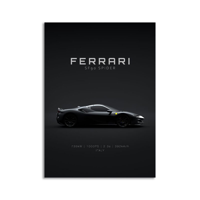 This 2021 Ferrari SF90 Spider digital poster is clean, technical automotive wall art with a detail-forward, premium look. It’s built for modern interiors where less is more – strong silhouette, controlled contrast, and a focused composition.