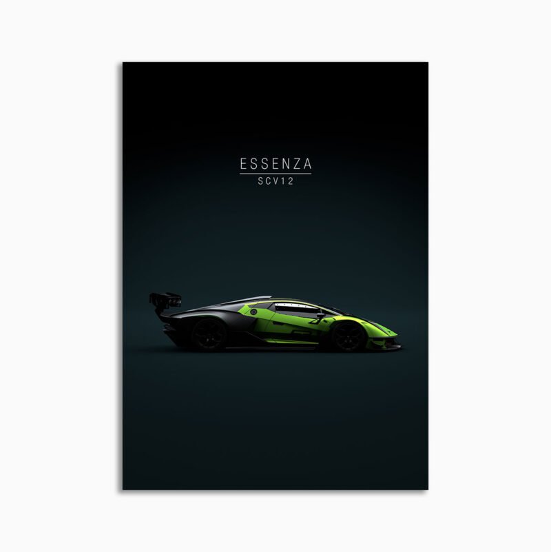This 2021 Lamborghini Essenza SCV12 digital poster is minimalist automotive wall art designed for modern interiors. It emphasizes silhouette, proportion, and a premium, gallery-like presentation.
