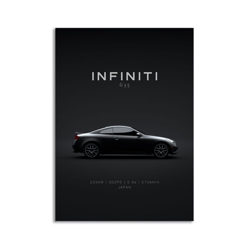 This 2006 Infiniti G35 Coupe digital poster is clean, technical automotive wall art with a detail-forward, premium look. It’s built for modern interiors where less is more – strong silhouette, controlled contrast, and a focused composition.