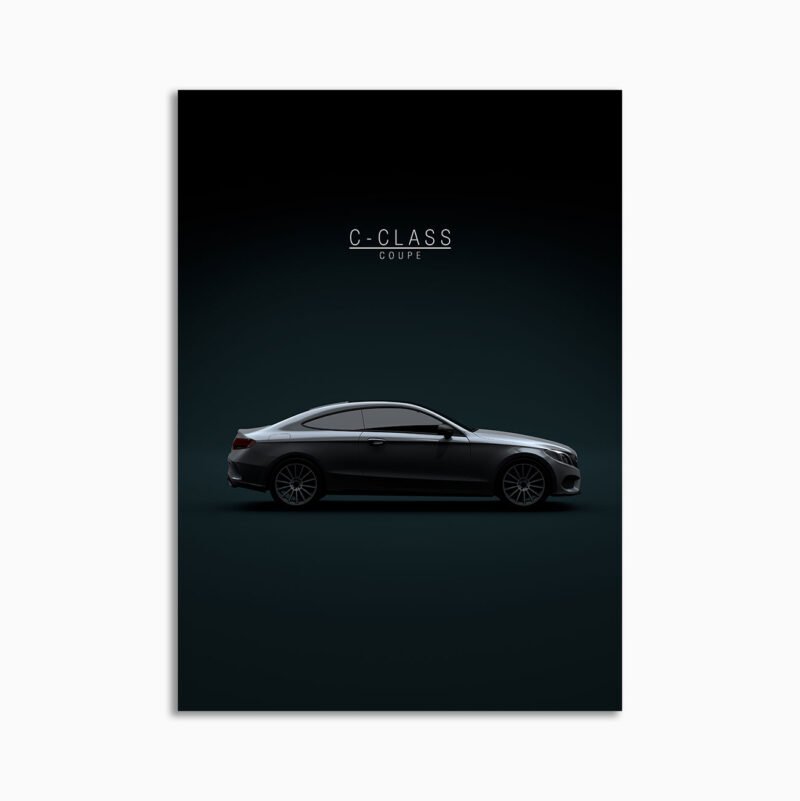This Mercedes-Benz C-class Coupe 2017 Grey digital poster is minimalist automotive wall art designed for modern interiors. It emphasizes silhouette, proportion, and a premium, gallery-like presentation.