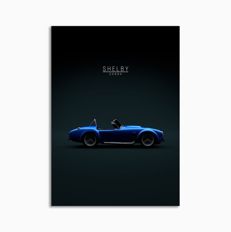 This 1965 Shelby Cobra 427 S-C – Blue digital poster is minimalist automotive wall art designed for modern interiors. It emphasizes silhouette, proportion, and a premium, gallery-like presentation.