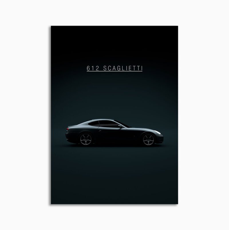 This 2004 Ferrari 612 Scaglietti digital poster is minimalist automotive wall art designed for modern interiors. It emphasizes silhouette, proportion, and a premium, gallery-like presentation.