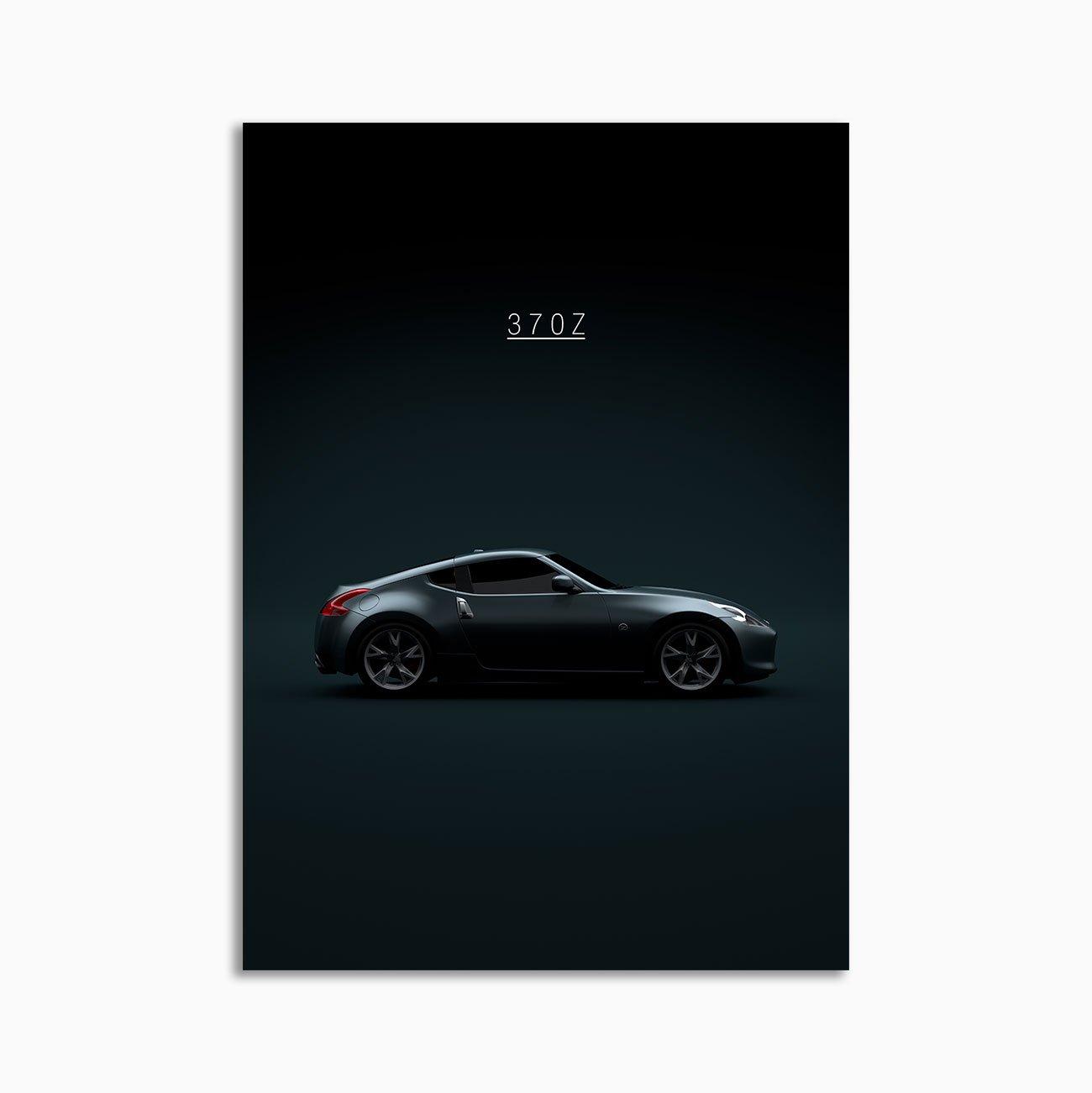 This 2010 Nissan 370Z (Z34) digital poster is minimalist automotive wall art designed for modern interiors. It emphasizes silhouette, proportion, and a premium, gallery-like presentation.