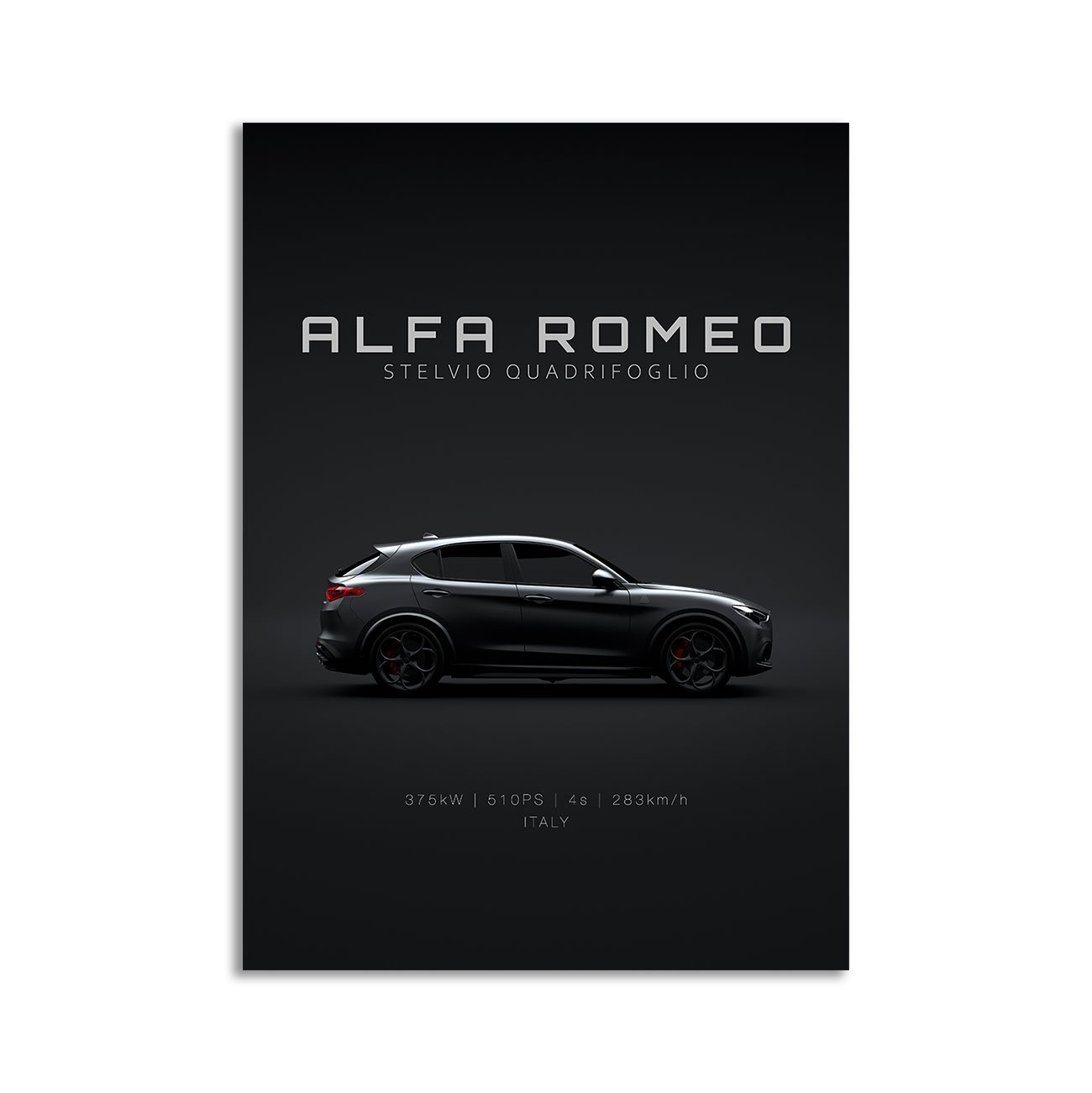 This 2018 Alfa Romeo Stelvio Quadrifoglio digital poster is clean, technical automotive wall art with a detail-forward, premium look. It’s built for modern interiors where less is more – strong silhouette, controlled contrast, and a focused composition.